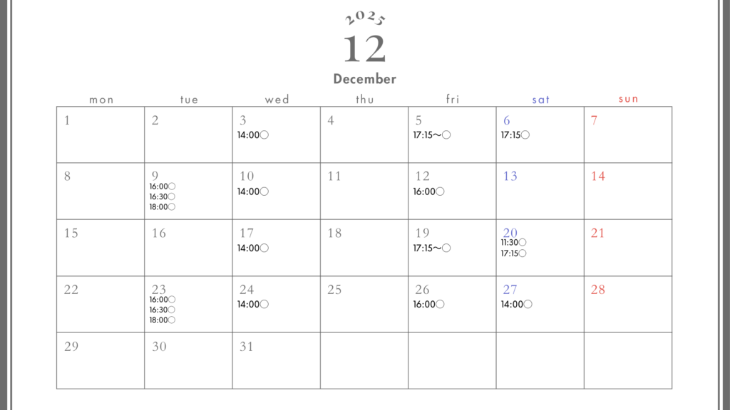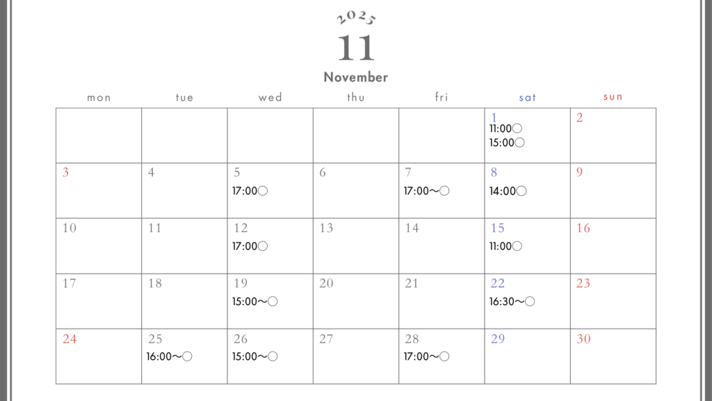 時間表記の説明ですが、たとえば17:00 ⚪︎ は17時のみ空いています。