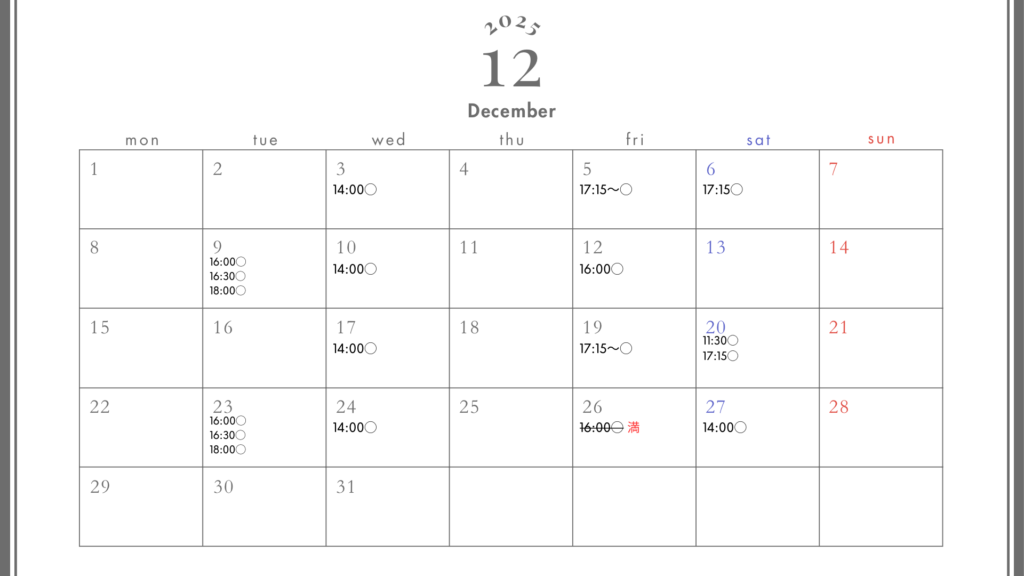 時間表記の説明ですが、たとえば17:00 ⚪︎ は17時のみ空いています。